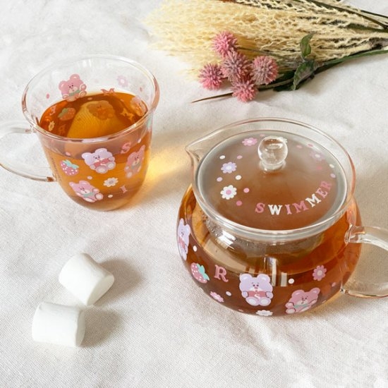 2018年に販売終了した「スイマー」の復活に合わせ、ゆめかわなガラスのポットやマグ、キャニスターが揃いました。イチゴやくまのモチーフやパステルカラーが乙女心をくすぐります♪