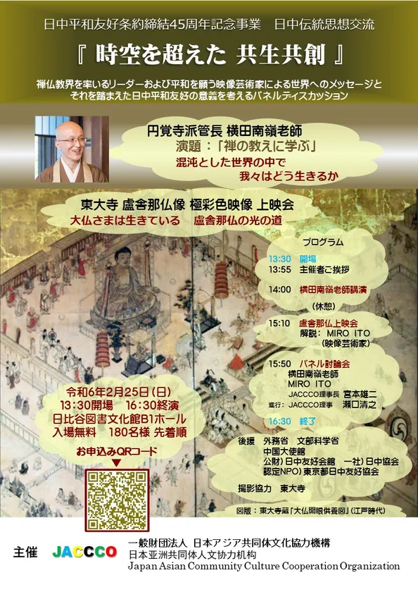 一般財団法人日本アジア共同体文化協力機構(代表理事・会長 福田康夫 東京都港区)は日中平和友好条約締結45周年にあたる2023年度の締め括りとして、「時空を超えた共生共創」と題して、講演およびパネルディスカッションのイベントを開催します。「混沌とした世界の中で我々はどう生きるか」をテーマに、華厳の思想など日中伝統思想をベースとした文化交流の現代的意義と将来の役割を考える機会にしたいと考えております。