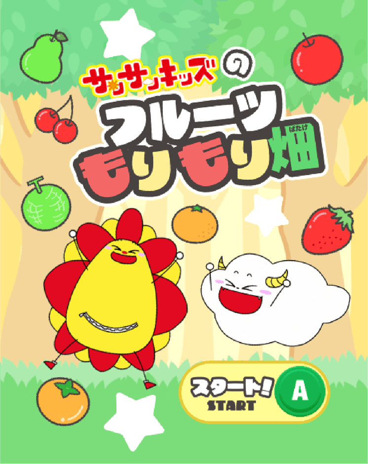 作品概要:サンサンキッズのフルーツもりもり畑(ばたけ)サンサンキッズの仲間たちがフルーツ狩りに出かけたよ!フルーツを同じ色のカゴに上手に入れられるかな?