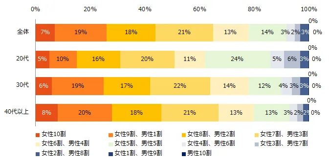 年代別で見ると、「女性6割以上」の割合は、年代が上がるほど高まる結果に。(20代:62%、30代:78%、40代以上:80%)。若い年代ほど、男性の分担割合が高いことが分かりました。