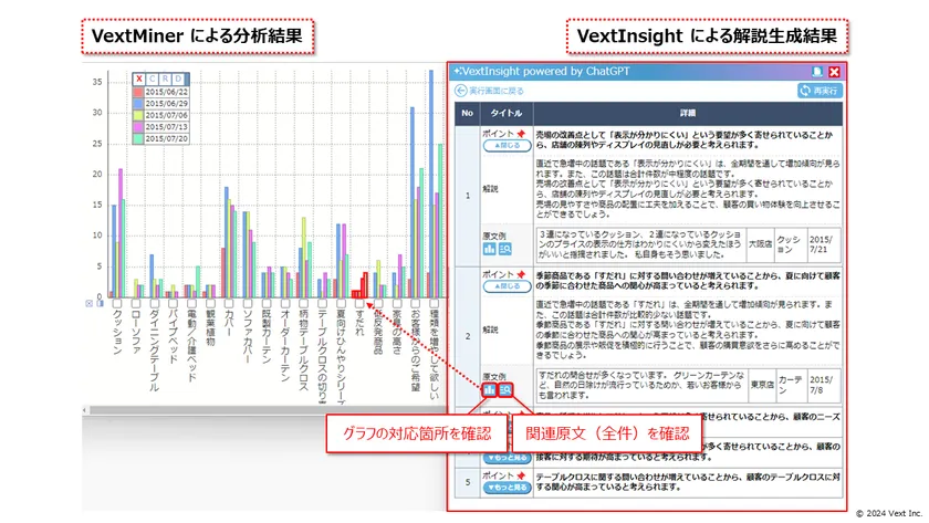 VextInsightによって生成された解説は、VextMinerの分析結果と連動しており、根拠となった分析結果の対応箇所の確認やテキストデータの原文参照(全件)をワンクリックで行えるようになっています。「主要な特徴(生成された解説)/分析結果の全体像/実際の原文単位の情報」という抽象度の異なる情報をシームレスに行き来できる本機能により、分析結果に対する深い理解を短時間で得ることを実現しています。また、本機能により、生成AI特有のハルシネーション(=事実に基づかない情報)チェックも可能となります。