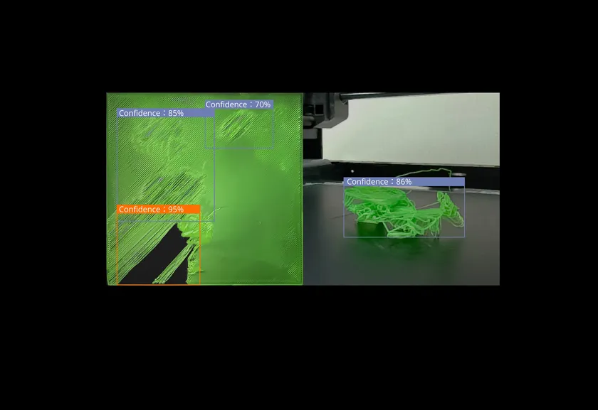 X1EのAIアルゴリズムは、LiDAR(ライダー)センサーとカメラが常に監視し、1層目のレイヤーの印刷ミスやスパゲッティ状の印刷ミスを検知できます。これにより、造形が失敗した場合には自動的に一時停止し、致命的な障害を防ぐことができます。
