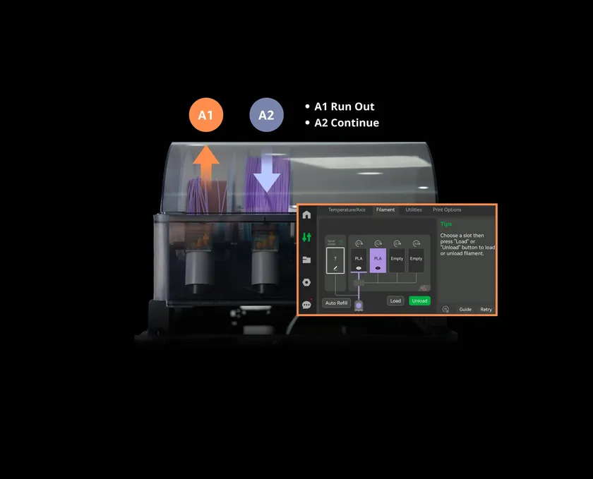 また、AMSシステムは、フィラメントが無くなった場合に自動で次のスプールに切り替える機能を搭載しています。そのため造形を中断する必要がなく、生産効率を向上させることができます。