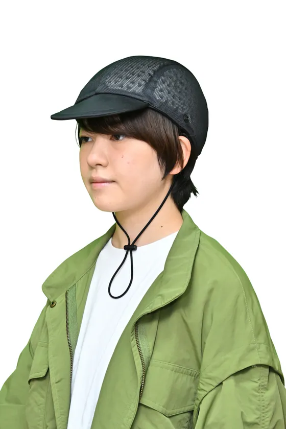 低反発エラストマー樹脂が運動エネルギーを熱エネルギーに変換することで、衝突・転倒時の頭部への衝撃を緩和。ヘルメットに使われる従来の発泡樹脂と違い、繰り返しの使用が可能。