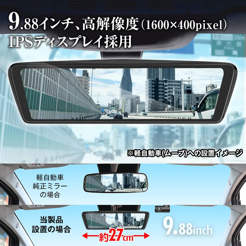 液晶は純正ミラーとほぼ同様のサイズ、軽自動車からミニバンでも圧迫感・違和感のない形状に仕上げました。幅広い視野角に対応するIPS液晶、見やすい高解像度(1600×400pixel)の大画面でいつでもしっかり後方の情報確認ができます。