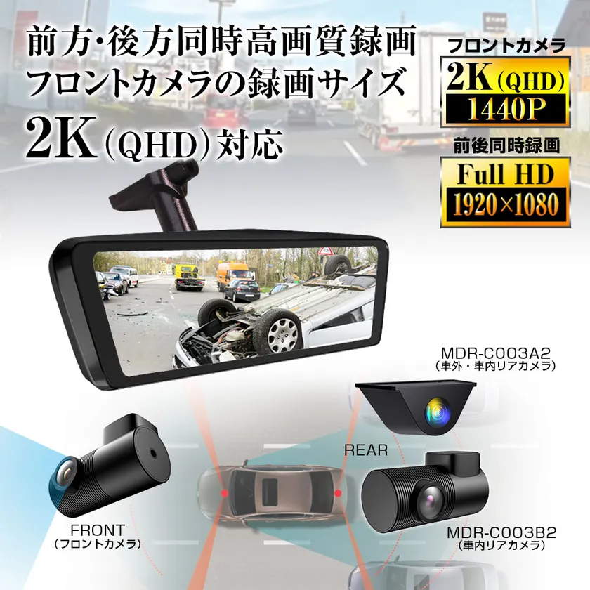 前方カメラ2K、後方カメラFull HDでの録画ができます。