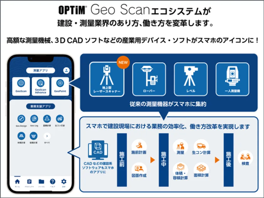 「Geo Scanエコシステム」とは、上述のハードウェア(測量機器)やソフトウェアを、アプリケーションとしてスマートフォン上に集約し、建設現場の総合的な業務効率化を実現するためのエコシステムです。これにより、建設現場における「測量に関わる業務」を効率化し、働き方改革の実現に貢献する機能の充実化を進めております。