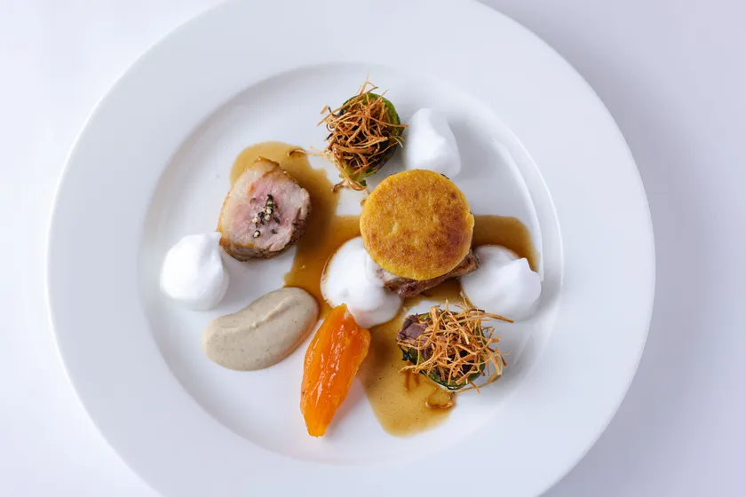 こんがりと焼き上げた福島県産あぶくま三元豚ロース肉にあんぽ柿とクリームチーズを練り合わせたクルートをのせて、豚肉のジューソースを添えてさらに旨味を補います。生のあんぽ柿とクルートに仕立てたもの、藁と雪にそれぞれ見立てた牛蒡の素揚げと牛乳のフォーム。異なる味わいと食感が、お料理に心地よいリズムを刻みます。福島の雪景色をイメージしてお召し上がりください。