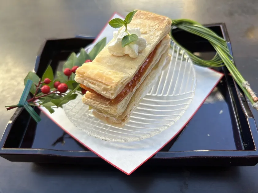 サクサクのパイ生地に、さつまいもの栗きんとんと生クリーム、そして、カットしたあんぽ柿を3枚のパイの間に交互に重ねた贅沢なミルフィーユ。