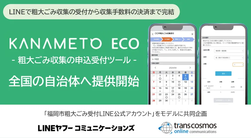 LINEヤフーコミュニケーションズ株式会社(本社:福岡市博多区、以下 LNEヤフーコミュニケーションズ)およびtranscosmos online communications株式会社(本社:東京都豊島区、以下 TOC)は、LINEを活用し粗大ごみ収集受付から手数料決済までオンラインで完結できる行政向けサービス「KANAMETO ECO(カナメト エコ)」を共同企画しました。2024年1月30日よりTOCが全国の自治体に向けて提供開始します。