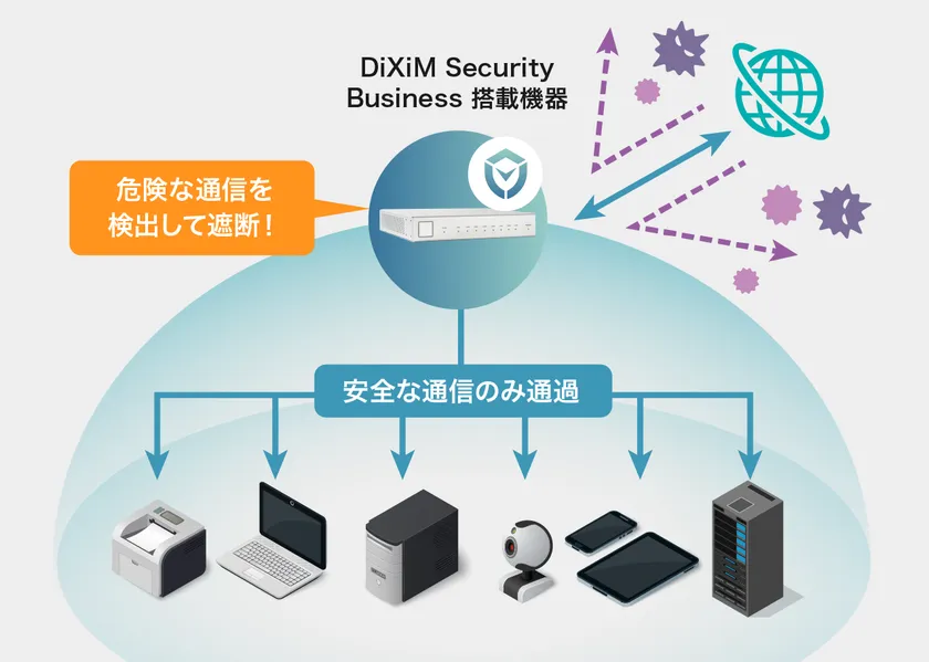 DiXiM Security Business は、ルーターなどのゲートウェイ機器に組み込むことを想定したサイバーセキュリティサービス DiXiM Security の法人向けサービスです。
