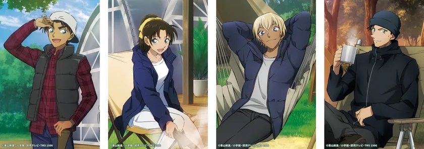 豊かな自然の中でグランピングを楽しむ7人(江戸川コナン、工藤新一、毛利蘭、服部平次、遠山和葉、安室透、赤井秀一)の描き下ろしイラストが登場!