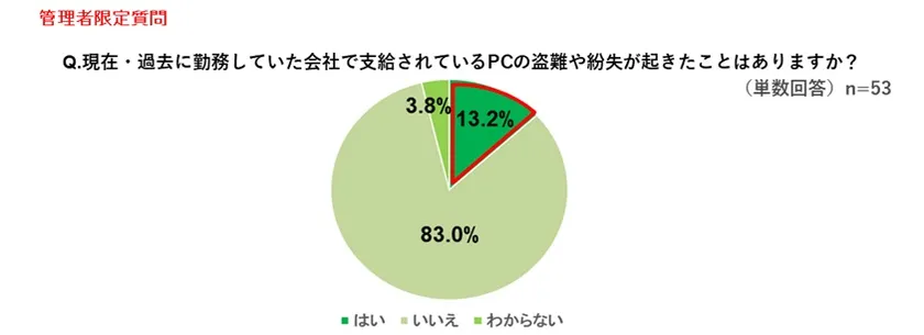 管理職対象に「現在・過去に勤務している会社で自社PCの紛失・盗難が起きたことがあるか」という質問をしたところ、約13%が 「現在・過去に自社PCの盗難や紛失が起きたことがある」と回答しました。このうちの7割が実際に情報漏洩など大きな損害が起きた報告があり、盗難や紛失に遭わないための事前の対策の必要性が顕著に現れる結果となりました。