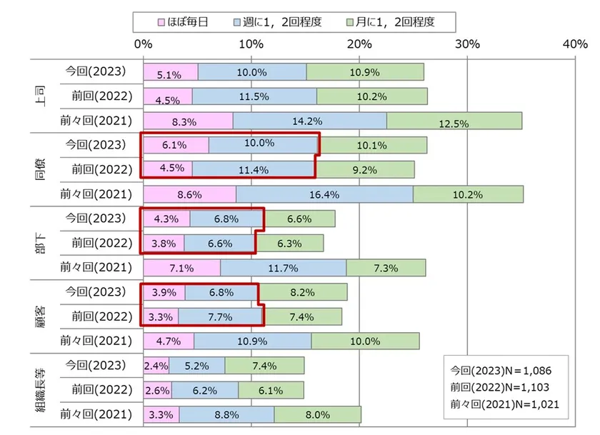過去半年間において、顧客から就業時間外において業務に関して緊急性のない電話やメール(LINEなどを含む)があり、通話・返信などを週1回以上対応している人は、前回調査と比べて、0.3ポイント(11.0%→10.7%)とやや減少しており、同僚とのやりとりにおいては0.2ポイント(15.9%→16.1%)、部下とのやりとりにおいては0.7ポイント(10.4%→11.1%)の増加となっており、就業時間外に業務上の対応をしたことがある人の割合は横ばいとなっています。月1回以上就業時間外に業務上の対応をしたことがある人は2021年度では3~5人に1人、2022、2023年度には4~6人に1人となっており、つながらない権利は22年度にかけて大きく進展したものの、その後あまり進展していないと想定されます。(図4)