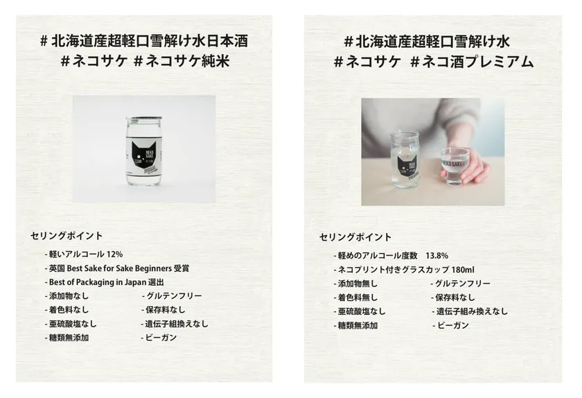 海外向けに立ち上げた「#北海道産超軽口雪解け水日本酒」の「ネコサケ」ブランドは、現在世界15カ国に展開中ですが、よい日本酒が簡単に手に入る日本での展開予定は当初はありませんでした。ですがお客様の声を受けて2019年より北海道限定の国内展開を始めてからは、国内でも軽めで低アルコールの日本酒ニーズが大きいことに気がつきました。