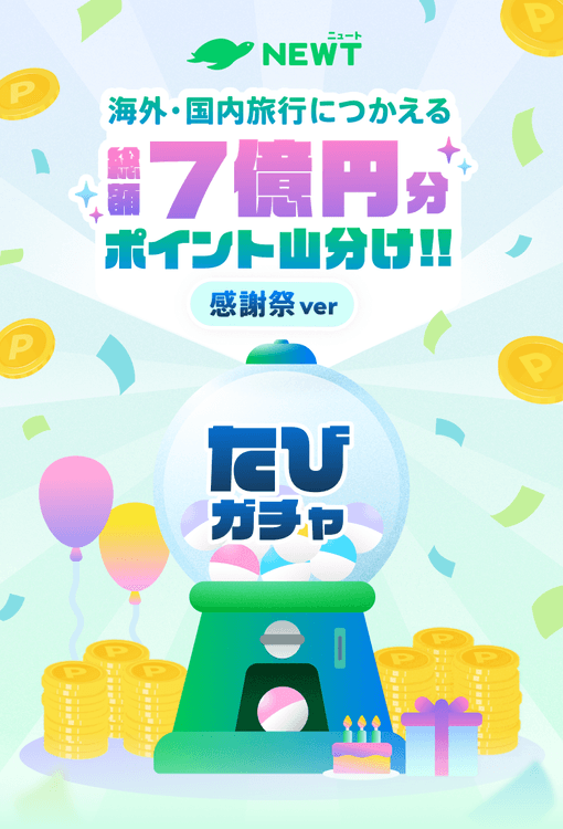 4周年の感謝を込めた特別企画として、豪華ポイントが当たる『たびガチャ』を実施いたします。国内・海外旅行の予約にご利用いただけるポイントを最大50,000円分プレゼントいたします。スマホで手軽に運試しを楽しみながら、理想の旅を現実にするための強力な後押しをお届けします。ぜひこの機会にお楽しみください。