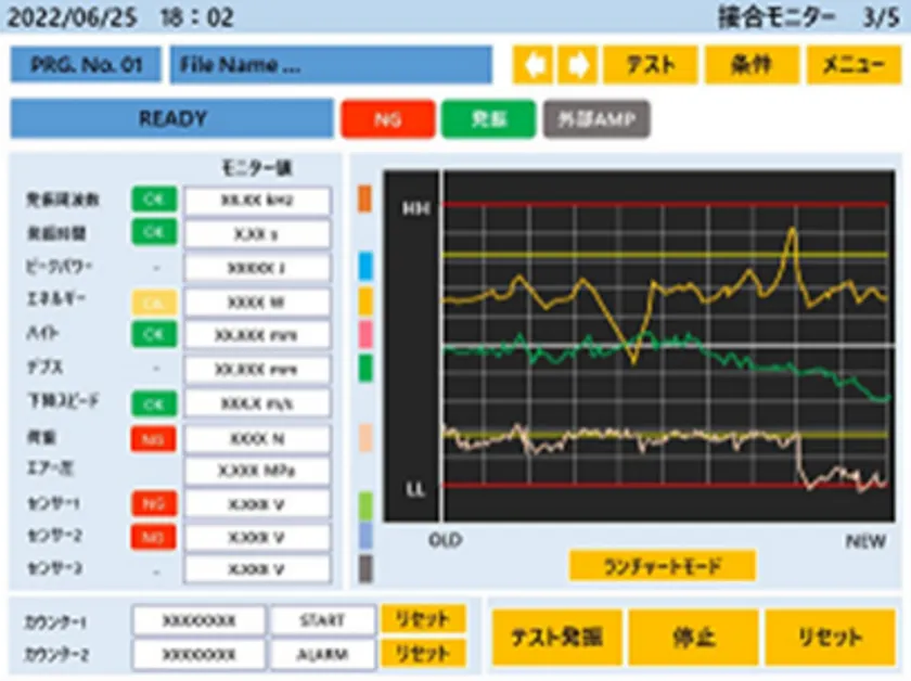 接合結果の経時変化をモニタリングするランチャート機能により、各パラメータや外部センサーの値を一元監視することが可能となり、設備のメンテナンス性が向上しました。ホーン交換時期の予測や、万が一の故障の兆候検知に役立ちます。