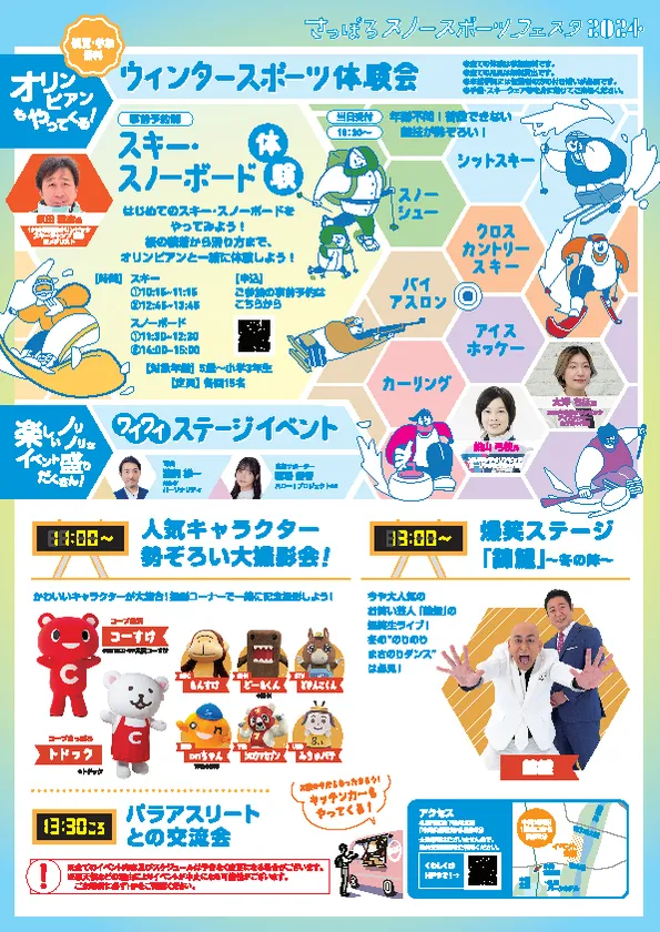 イベント会場のステージでは、CO・OP共済キャラクター「コーすけ」なども登場する人気キャラクターたちによるイベントや、お笑い芸人「錦鯉」爆笑生ライブ、パラアスリートとのふれあいイベントを予定しています。