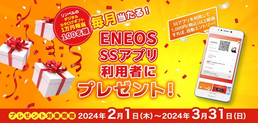 当社(代表取締役:宮田 知秀)は、2月1日(木)から3月31日(日)まで、ENEOSのサービスステーション(以下、「SS」)において、ENEOSサービスステーションアプリ(以下、「ENEOS SSアプリ」)をご利用いただいたお客様を対象に、デジタルカタログギフトが当たる、「ENEOS SSアプリ 毎月プレゼント企画」(以下、「本企画」)を実施しますので、お知らせいたします。