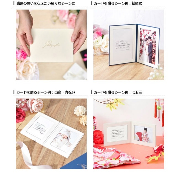 写真とメッセージカードを差し込むだけで簡単にセットできる差し込みタイプ。のりやテープなどは一切不要で入れ替えもカンタンです。2面とも写真をセットすることも可能。贈るシーンや伝えたい想いに合わせて、自由に組み合わせることができます。