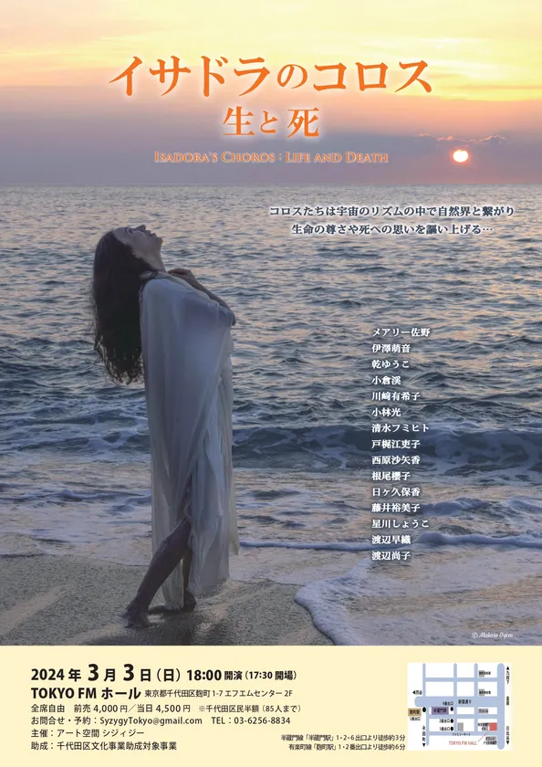 2019年7月7日に東京の中心である千代田区三番町にオープンしたアート空間です。オープニングイベント「舞踊詩:山田耕筰とイサドラ・ダンカン」を皮切りに、シリーズ2「ロマンから神秘への道:スクリャービンとイサドラの遭遇」、シリーズ3「イサドラのコロス:調和への回帰」、シリーズ4「揺らぐ光と影のはざまに」、シリーズ5「イサドラのコロス:愛と悲劇」、シリーズ6「揺らぐ光と影のなかで」と公演を開催し、舞踊家メアリー佐野を中心に音楽家や、写真家などのアーティストとのコラボレーションからイサドラ・ダンカンの舞踊芸術を様々な局面から見つめ、深め、現代の舞踊の在り方を追求しています。今回の公演は千代田区の助成の元、はじめてのホールでの開催となりました。