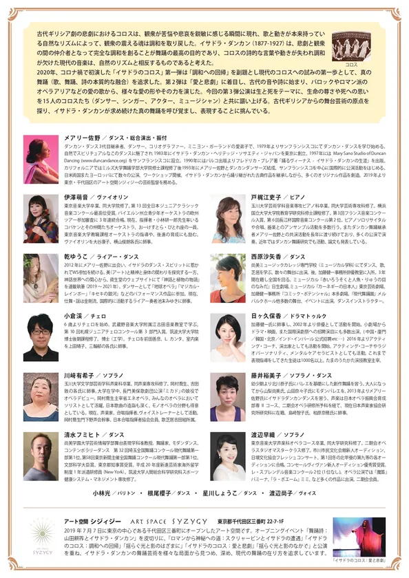古代ギリシア劇の悲劇において観衆が苦悩や悲哀を鋭敏に感じる瞬間に現れる“コロス”は悲劇と観衆の間の仲介者として、観衆の震える魂に完全な調和を創る存在でした。古代ギリシアからの舞台芸術の原点を探り、現代において失われたコロスの詩的な言葉や動き、イサドラ・ダンカンが求め続けた真の舞踊を呼び覚まし、表現することに挑むシリーズの第3弾です。2020年コロナ禍で初演した「イサドラのコロス」第一弾は調和への回帰を副題とし、現代のコロスへの試みの第一歩として、真の舞踊(歌、舞踊、詩の本質的な融合)を追求、2021年の第2弾は愛と悲劇に着目し、古代の音や詩に始まり、バロックやロマン派のオペラアリアなどの愛の歌から様々な愛の形やその力を演じました。今回の第3弾公演は生と死をテーマに、生命の尊さや死への思いを17人のコロスたち(ダンサー、シンガー、アクター、ミュージシャン)が謳い上げる壮大な作品となります。