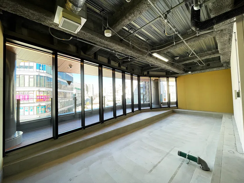 建物低層部は、前面が開放されたガラスカーテンウォールで覆われ、建物目の前に位置するバス停留所の人々や、街行く人々に店内の活気と魅力を余すことなく伝えることが可能です。ショーウィンドウのような開かれた空間は、テナントの賑やかで華やかな雰囲気をひときわ際立たせ、地域コミュニティとの交流を促進します。