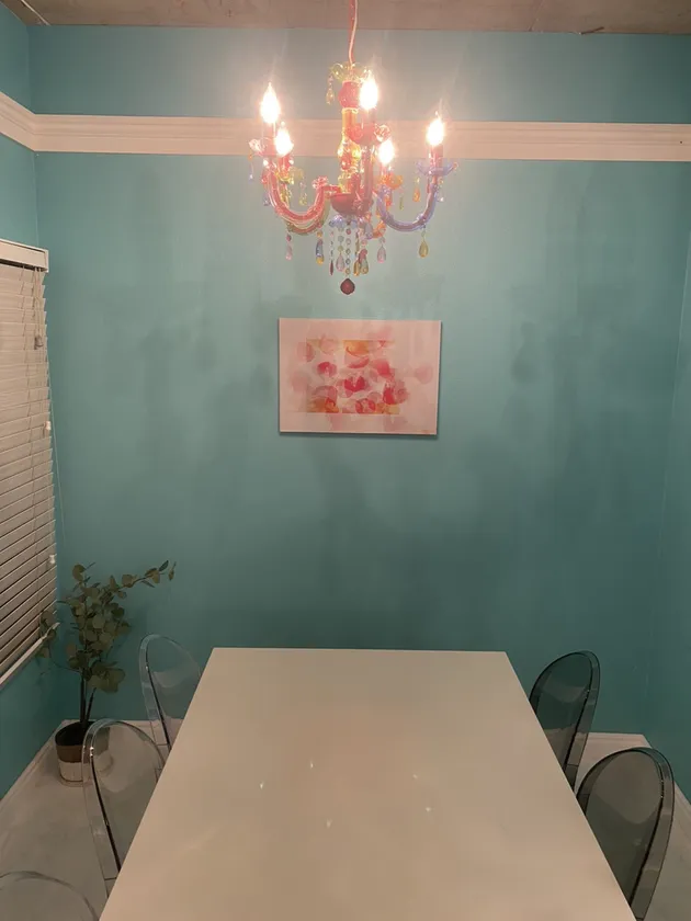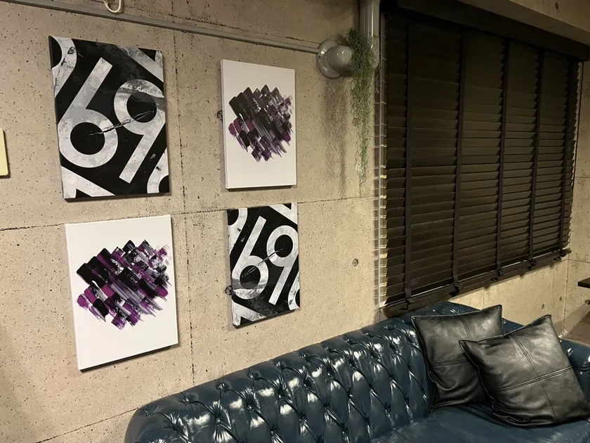 リノスペrich赤坂は今回アートを飾らせていただいた4スペースの中で、1番アートを飾る面積も広くとても明るいスペースとなっております。内装がカラフルなこともありポップで色味のアートがマッチすると思い選ばせていただきました。青壁の中心にあえて反対色である赤系のアートがより空間に明るさを与えています。