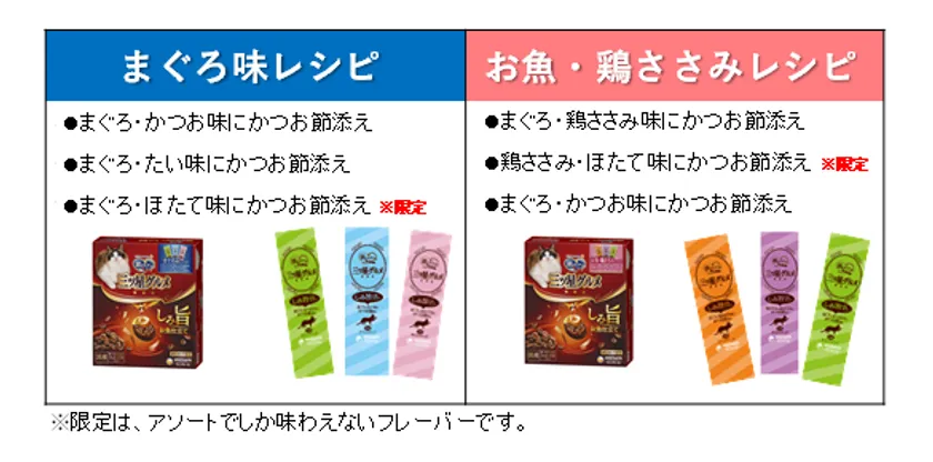・「まぐろ味レシピ」と「お魚・鶏ささみレシピ」から愛猫の好みに合わせて選べます。