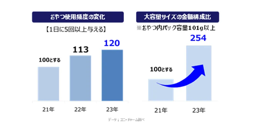 飼い主が愛猫におやつをあげる頻度が高まり、猫用おやつ市場は年々拡大しています。なかでも、大容量サイズの構成比が高まっています。