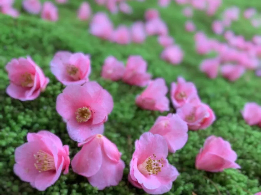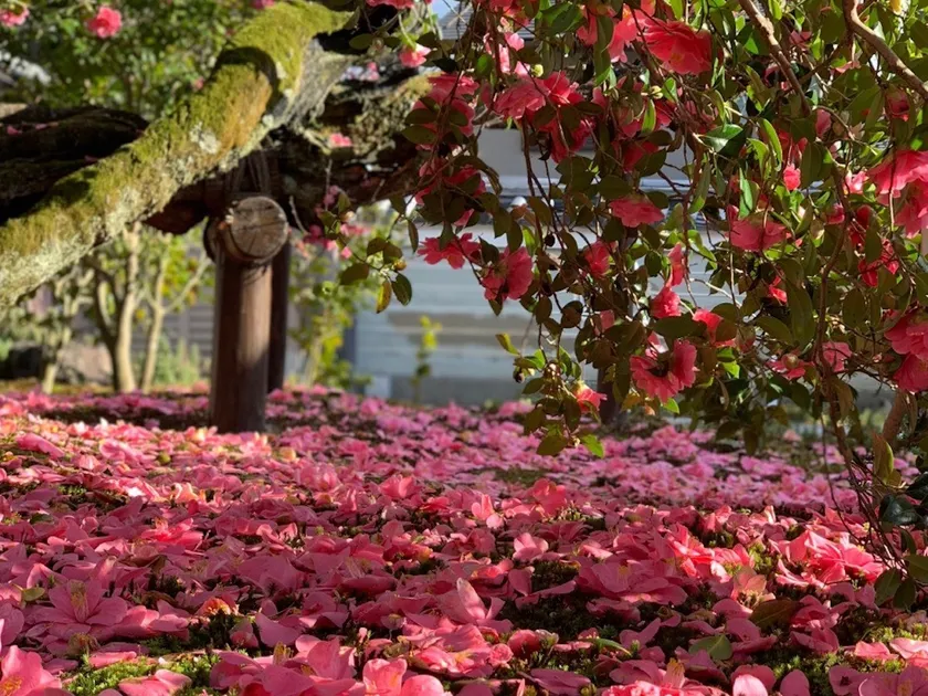 庭園で見ることができる椿は、日光椿(京都市指定天然記念物)をはじめ、散椿、白牡丹椿、舞鶴椿など、100種類以上。椿は種類によって開花時期が異なるため、訪れる時期によって違った景色を楽しめ、リピーターが後を絶ちません。開花中はもちろん、苔の上にぽとりと花が落ちる姿や、散椿の花びらが地面に散り積もる様子は、儚くもありつつ、散ったあとも楽しませてくれるのが椿の醍醐味でもあります。