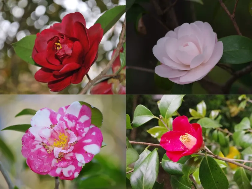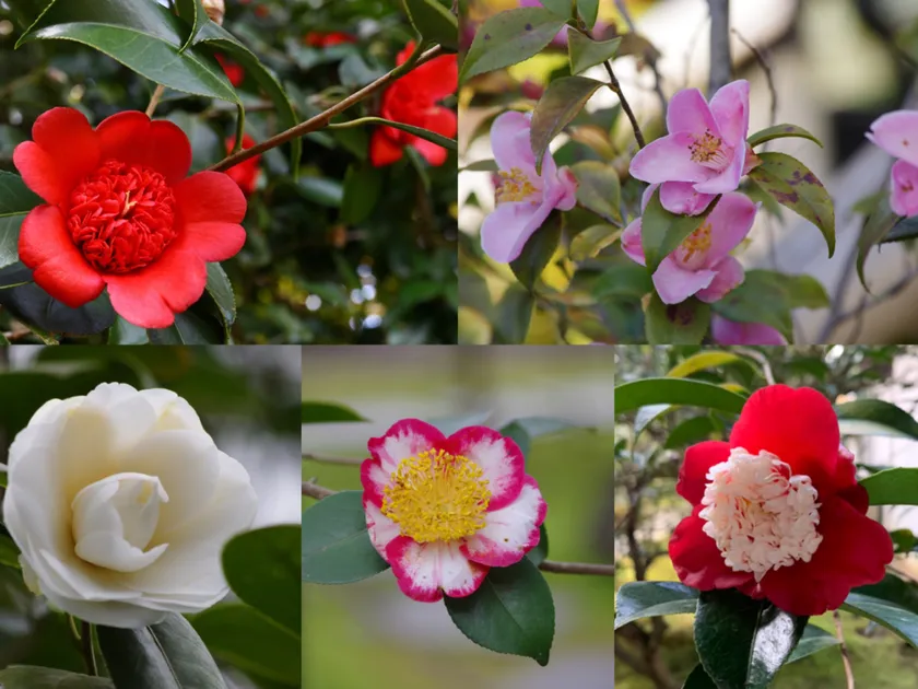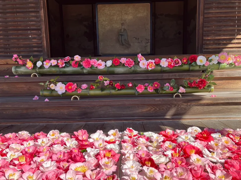 毎年庭園入口には、椿を用いたフォトスポットがあります。その時に咲いている椿があしらわれ、ピンクや白など色とりどりの色彩はフォトジェニック間違いなし。庭園内の小さな手水鉢には、椿が浮かべられていることも。