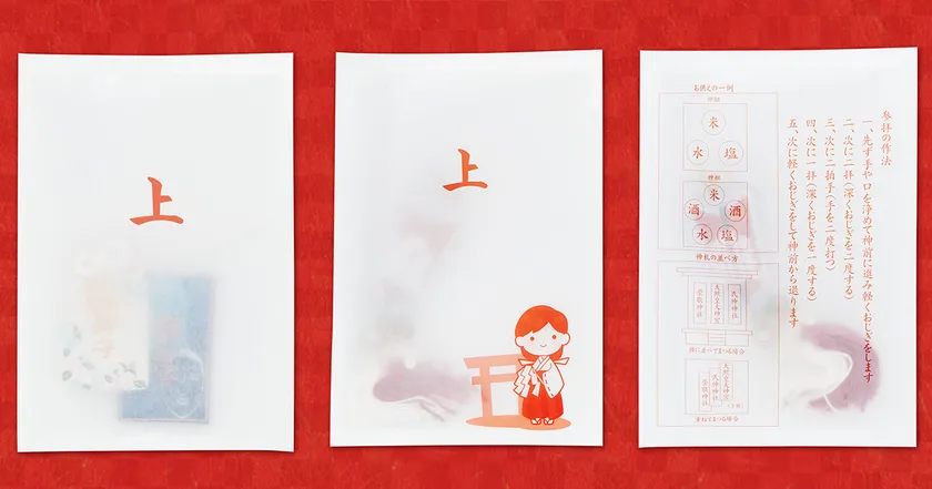 従来からある授与品袋は白い上質紙でできており、御守や御札などをお授けする際のお収め袋として広く利用されています。「透けてる授与品袋」は白い授与品袋の一方の面を透過性の高い「グラシン紙」にすることで、授与品袋の中にどんな授与品が収められているかをひと目で確認できます。「透けてる授与品袋」は授与所での識別性向上に加え、その見栄えの良さから参詣者の興味関心に強く訴えかけることができる、これまでにない新しい授与品袋です。