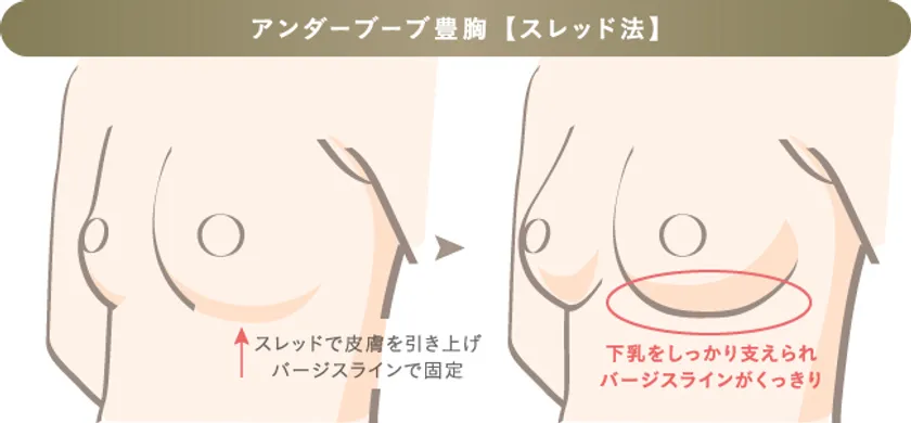 アンダーブーブ豊胸には2つの施術方法があります。ひとつは、バージスラインをくっきりさせる「スレッド法」。もうひとつは、下乳にたくさん脂肪を注入できるように、下乳の注入スペースを広げる「リゴトミー法」です。