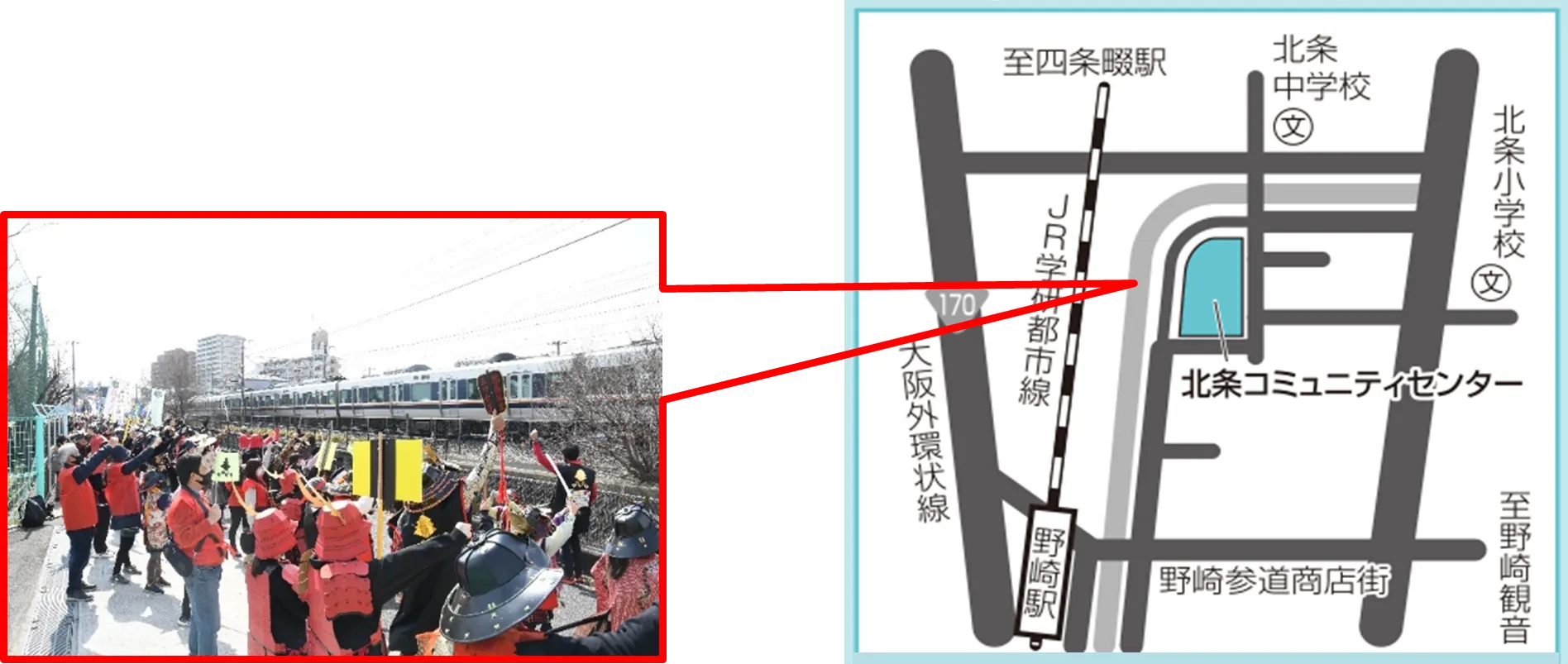 より多くの人に大東の武者行列を見ていただくため、JR学研都市線の線路沿いを通る際には、通り過ぎる電車に向かって勝鬨をあげます。