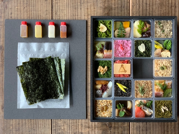 「手織り寿し」をお手軽にお楽しみいただける折詰め弁当です 。十五穀米と京都千鳥酢で仕立てたシャリや約40種類の食材、付属の焼き海苔 、特製調味料を織りまぜ ながら 、ご自身だけの味の組み合わせをぜひご賞味ください。