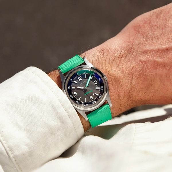 ツールウォッチとしての本質を追求し、暗闇でも一瞬で時間を読み取れるよう設計。インデックスと内部ベゼルにはSuper-Luminova®BGW9を採用し、ポリッシュ仕上げの“シリンジ”型時針とグリーンのペイントが施された分針も、同じくSuper-Luminova®により優れた視認性を実現している。37mmの316Lステンレススチールケースに、ダブルドーム型サファイアクリスタルを組み合わせたタフな仕様。さらに、150mの防水性能を備え、アウトドアやアクティブなシーンでも安心して使用できる。