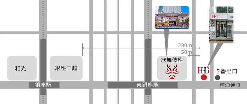 (東銀座駅5番出口より徒歩30秒、銀座駅より徒歩5分)