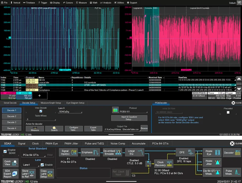 同時に発表したPCIe 6.0デコード・オプションは、オシロスコープ上でPCI Express 6.0のPAM4信号のデコードを業界初で実現し、デバッグの機能を強化します。このソフトウェアは、改良されたシリアル・データ解析ソフトウェアSDA Expertと連携し、イコライザのシミュレーションなどを連携して品質改善された信号を用いてデコードすることでデコード・エラーを防ぐことができます。