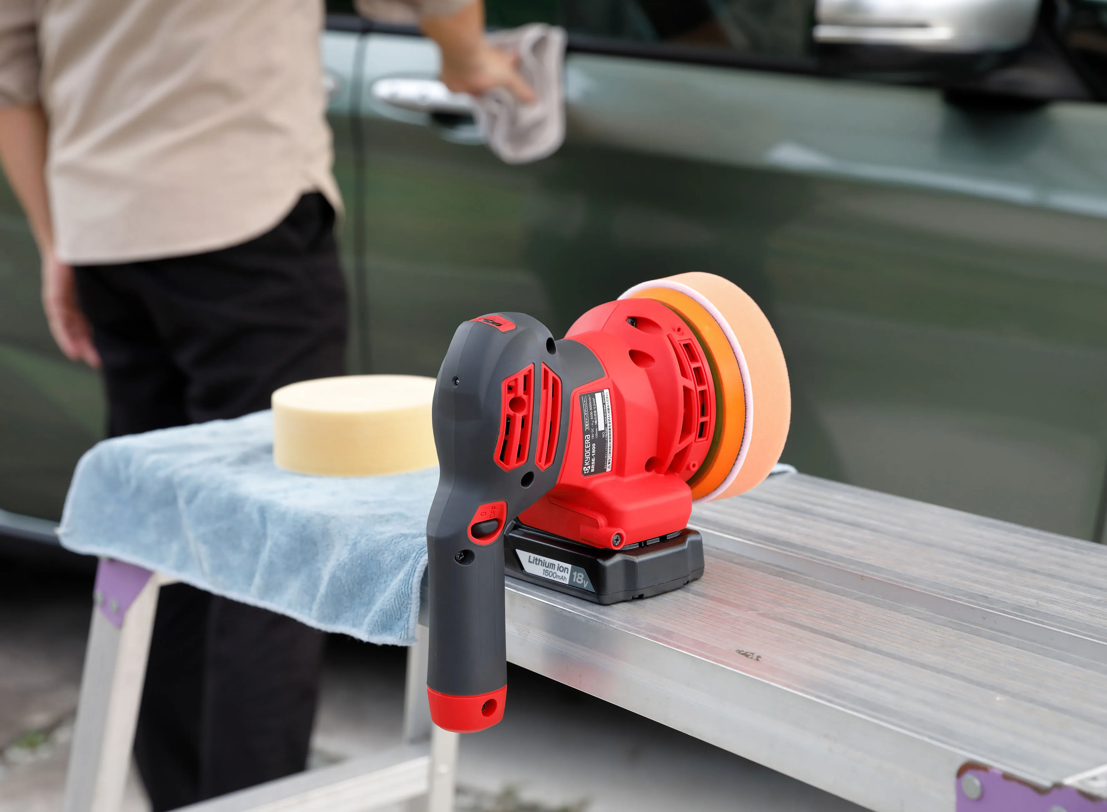 サンダポリッシャーは、円形のパッドが小刻みに振動(偏芯運動)しながら回転運動し、車のボディや木材の表面を研磨し、キレイな状態に仕上げる電動工具です。