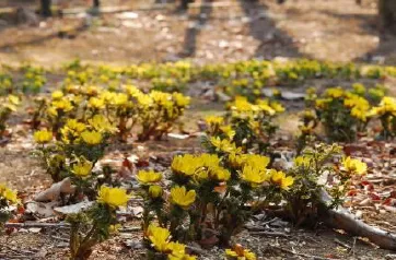 冬の寒さが残るこの時期、ほかの花がまだ咲いていないなか、春一番に咲くバイカオウレンの群落は、約50平方メートルと日本有数の植栽面積を誇っております。
