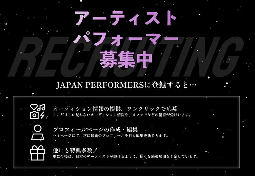 「JAPAN PERFORMERS」は、日本全国にいるアーティストやパフォーマーが所属するプラットフォームです。
