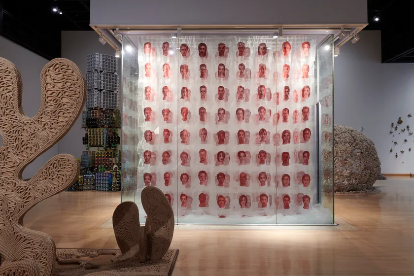 三角瞳は第19回太郎賞展に入選している。その時の作品は、無数のフィギュアによるインスタレーションであった。乱雑に積み重ねられたフィギュアの洪水が、現代社会における「個」の在り方を強い圧迫感をもって問う。今回は刺繍による作品。表は人物の顔、裏は遺伝子を表す赤い糸。単なる入れ物としての肉体を暗示する。薄い布切れに刺繍された無数の「個」が折り重なるように並べられる。表現内容と新鮮な手法、展示方法がうまくかみ合い、説得力をもった作品となった。(土方明司)