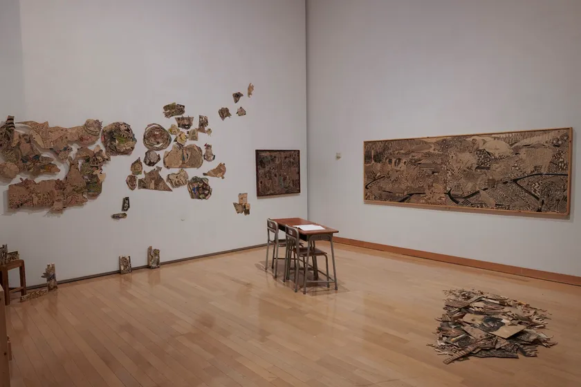 「あなぐまち」とは、作者がずっとともに生きてきた「まち」の名前である。その意味で正しくは「作品」を超えたものかもしれない。しかし作者の手で作られたものであることも確かだ。作者が作った作品が、作品であることを超えて作者そのものになっていく。ここにはそう実感させるだけの現実味がある。多岐にわたる詳細な素材表記にも注目。(椹木野衣)