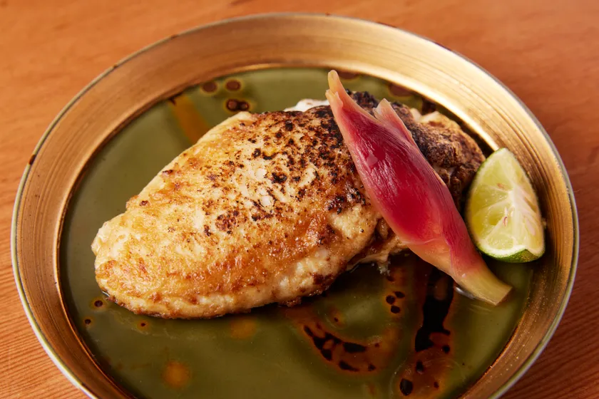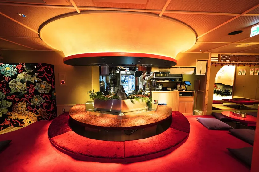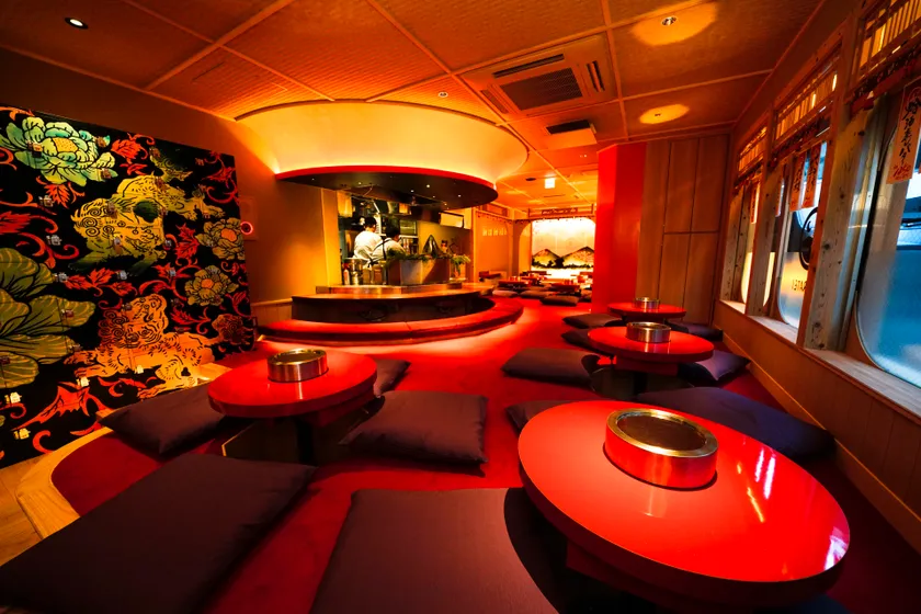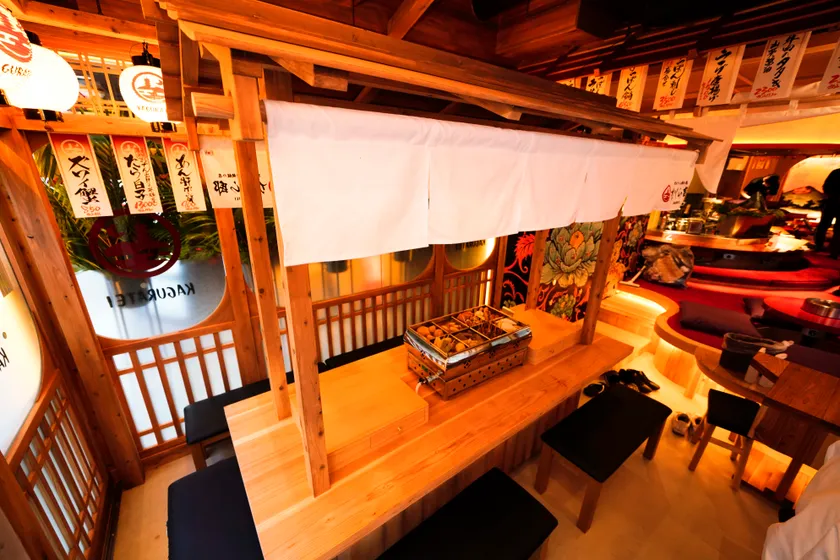 当店は、これまで敷居が高かった「鉄板焼きで呑む」「本格おでんで呑む」というシーンをカジュアルに刷新。暖簾をくぐると気軽に呑める「京おでん屋台」があり、その奥は鉄板をぐるりと囲む家に招かれたように寛げる堀テーブル席。