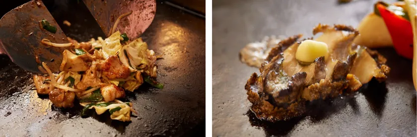また、各テーブルには保温用の鉄板を設置していますので、アツアツのままで楽しめる新スタイルの鉄板焼き店です。