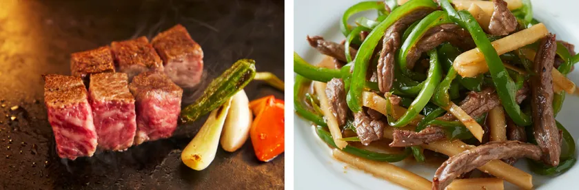 黒毛和牛イチボの他、ハラミや厚切り牛タン、青椒肉絲や、回鍋肉、豚キムチなどの中華、韓国メニューも