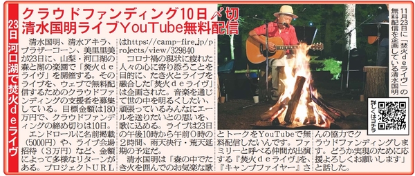 株式会社kuniaki.plusは、清水国明・清水アキラ・ブラザーコーン出演「焚火deライヴ」の無料配信のため、2020年11月10日(火)までの期間でクラウドファンディングに挑戦中!の記事が日刊スポーツで掲載されました。