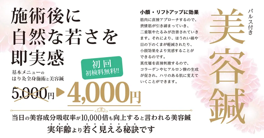 美容鍼または全身鍼灸のみ初回は4,000円(税込)となります。ある程度の期間で定期的に施術を行うことが、美容・健康ともに最も効率がよいと当院では考えておりますので、定期的な施術割引料金もご用意しております。