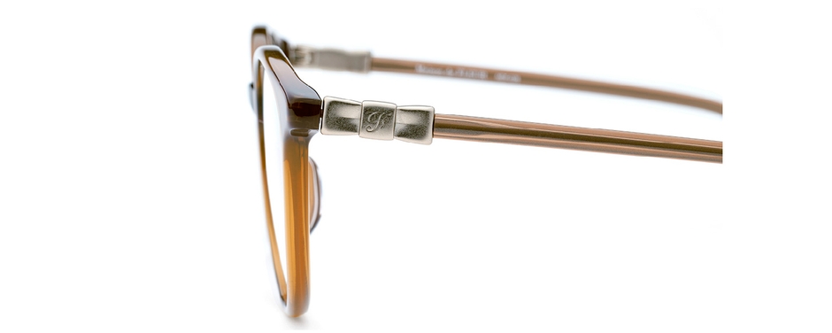 立体的なリボンをイメージしたメタルパーツがついたプラスチックフレーム。少しだけ目じりが上がったフォックスシェイプになっており、丸みのある形でも大人っぽい印象です。